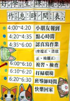 制定作息時間表主要希望小朋友按表操課,培養時間觀念,一開始有用海報張貼,過了半個月,當大家都知道作息時間後,只要時間到,會提醒他們,如果秩序控制不住,就必須喊口令,例如:全班站起來,眼睛閉上,鴉雀無聲後在逐一點名坐下。這學期大致上都能按表作息,小朋友似乎也都能配合時間安排,唯一他們不滿的是覺得沒有玩樂時間,後來和他們聊到平常來課輔班本當就是來寫作業的,該認真要認真,畢竟也沒要求禁止吃小點心,就是希望上了一整天的課後,能用輕鬆一點的心情來完成作業,經常這邊也會舉辦活動讓大家好好玩、放鬆,如果帶頭亂情結重大的人以後要考慮禁止參加活動,幾次說下來,效果滿好的,反問他們其實也都很希望作業時間安靜才能專心在時間內完成放心回家,發現作業完成度越來越高了。
